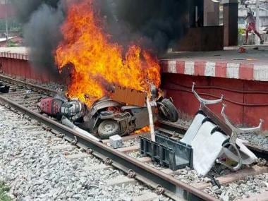 Smoke billows out after youngsters set on fire a bikes at railway track during a protest against the Agnipath scheme, at Ara Railway Station, in Bhojpur district, Bihar. ANI