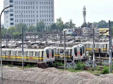 Delhi Metro trains parked at a yard. ANI
