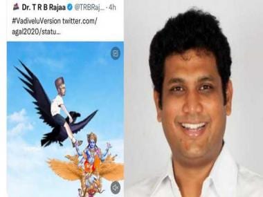 TRB Rajaa, who is the son of DMK Lok Sabha MP TR Baalu posted a tweet which had the image of representation Lord Vishnu mounted on Garuda and being hit by Sarvarkar sitting on a black . bird.