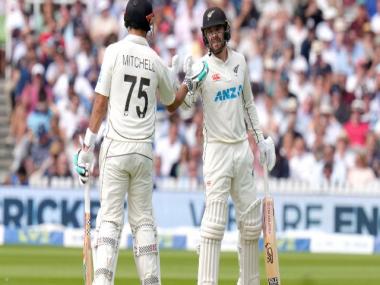 New Zealand’s Daryl Mitchell and Tom Blundell celebrate their 100 run partnership during the second day of Lord’s Test. AP