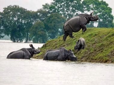 One-horned rhinos seen moving to an elevated area following floods due to incessant monsoon rainfall in Kaziranga National Park. PTI