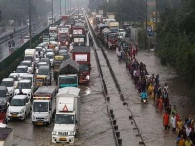 Commuters wade through waterlogged roads on the Delhi-Gurugram Expressway. Heavy rainfalls on Thursday led to traffic jams in Gurugram, Delhi and Noida. According to district administration on Thursday, Gurugram received 54 mm of rainfall. PTI