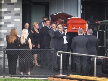 Shane Warne’s mother Bridgette Warne touches his coffin following a funeral service in Melbourne, Australia, on Sunday. A state memorial at the Melbourne Cricket Ground will take place on 30 March and will be open to the public. AP