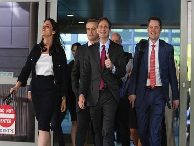 Davida Brook, left, Justin Nelson, centre, and Stephen Shackelford, right, attorneys for Dominion Voting Systems, exit the New Castle County Courthouse in Wilmington, Delaware. AP