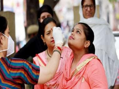 A healthcare worker collects a nasal swab sample of a woman for a COVID-19 test. ANI