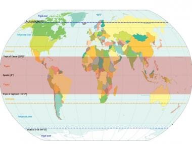 The Tropics are a region that is roughly defined as the area between the Tropic of Capricorn and the Tropic of Cancer. Although topography contributes to climatic variation, these areas are typically warm and experience little seasonal change in day-to-day temperature. The Tropics face several challenges including climate change, deforestation, urbanisation and demographic changes.