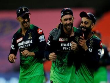 Glenn Maxwell, Virat Kohli and Faf Du Plessis of Royal Challengers Bangalore during Match 54 of the IPL 2022 between the Sunrisers Hyderabad and Royal Challengers Bangalore at the Wankhede Stadium in Mumbai on 8 May, 2022. Sportzpics for IPL