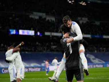 Real Madrid players celebrate as they win the Spanish La Liga match against Atletico Madrid at Santiago Bernabeu stadium in Madrid, Spain, on Sunday. AP