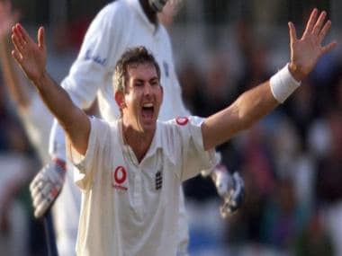 England’s Andy Caddick shouts for an appeal while Adrian Griffith of the West Indies looks on during the first innings of the fifth Test at The Oval in London in 2000. AFP