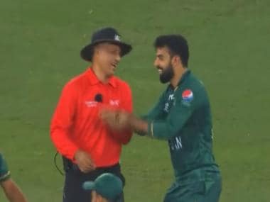 After the DRS, Shadab went to the umpire and tried to stretch the umpire’s hand to raise the finger in a funny manner towards the end of sixth over.