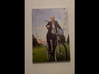 As the video plays, we can see the woman panning the video from one wall to another to show Boris Johnson’s pictures on the wall. In every picture, he can be seen riding a bicycle.