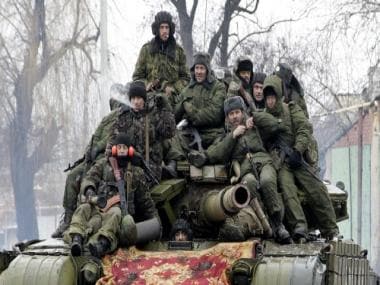 Russian soldiers atop a tank. AFP