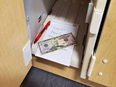 The hint, which was cleverly written in the professor’s music seminar class syllabus, reads, “Free to the first who claims; locker one hundred forty-seven; combination fifteen, twenty-five, thirty-five”. This passage guides to the locker number and passcode to the locker where the $50 bill was hidden. The note in the locker reads, “Congrats! Please leave your name and date so I know who found it.” Check professor’s post here: