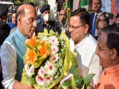 Rajnath Singh congratulates Pushkar Singh Dhami after newly elected BJP MLAs choose him as their leader. Dhami will take oath as the 11th chief minister of Uttarakhand on Wednesday. PTI