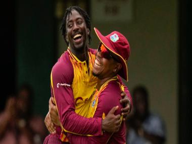 West Indies spinner Hayden Walsh celebrates with Shimron Hetmyer after the latter pulled off a stunning catch to dismiss Martin Guptill. AP
