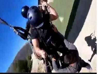 The clip shows two paragliders, both wearing safety gear. The worker is seen without any protective gear and is not hooked to the harness of the glider. He tried to stop the glider from lifting off. However, he was unable to free himself from the craft in time and ended up in the air due to strong winds.