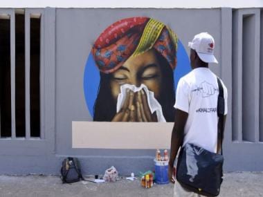 A member of the Senegalese graffiti collective RBS CREW, observes a graffiti representing a woman sneezing in a tissue as a preventive measure against the COVID-19 in Dakar. AFP